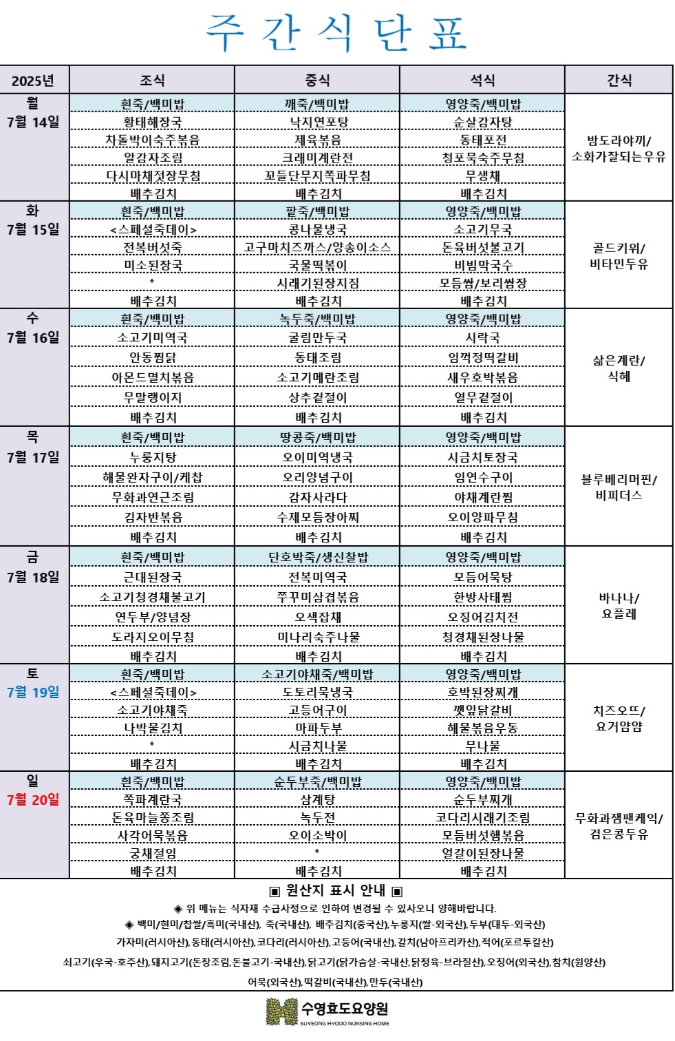 [7월] 1주차 주간 식단표